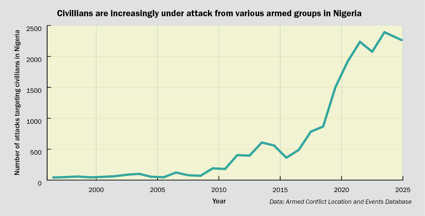 Yet, those 72 hours were not unusual in terms of Nigeria’s security situation. So far this year, Nigerians have experienced more than 2,300 attacks on civilians, according to data from the Armed Conflict Location and Events Database. That is an average of 50 attacks a week.